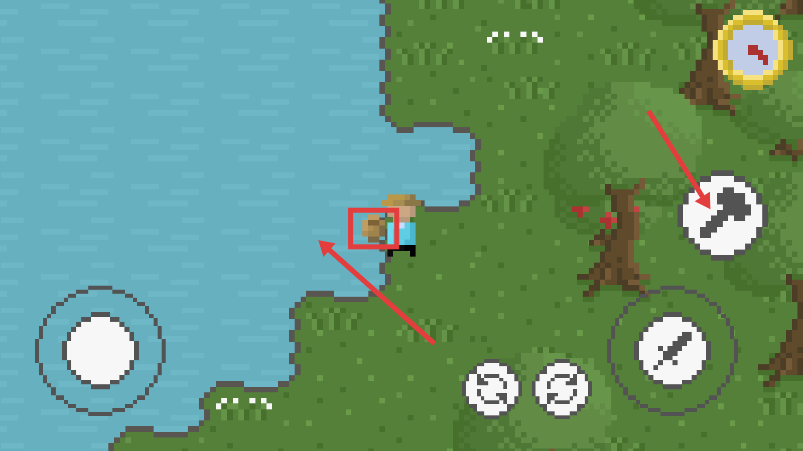 3、靠近资源点时,点击右侧【锤子】工具图标,让角色手持工具进行资源采集,积累农场发展物资。