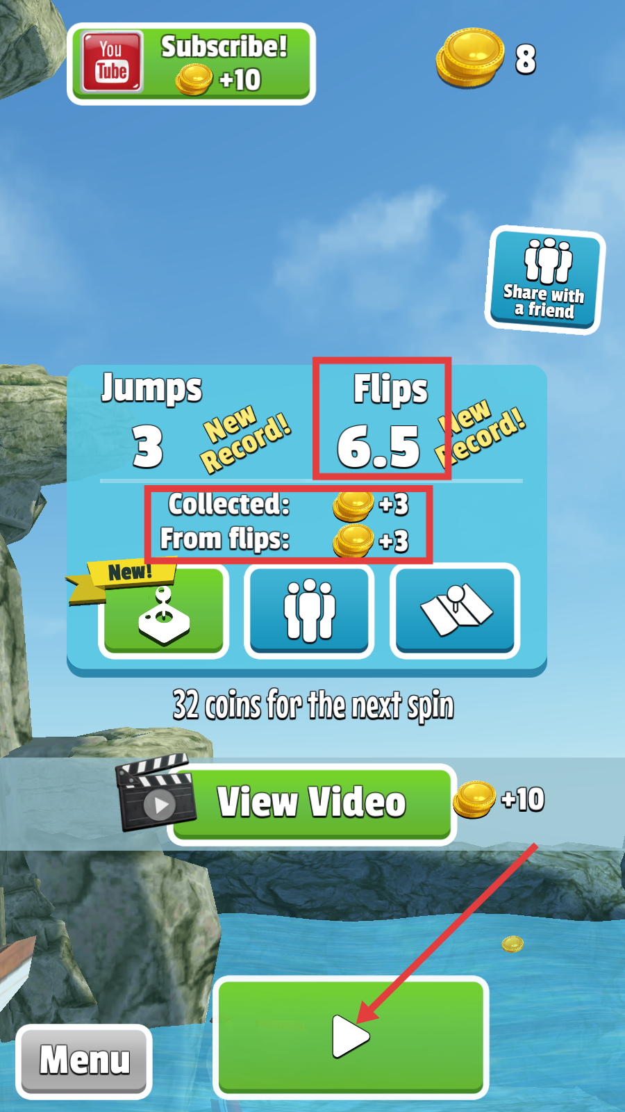4、结算界面关注【Flips-6.5】和【Collected-+3-Fromflips-+3】的金币收益,点击继续按钮挑战新记录。