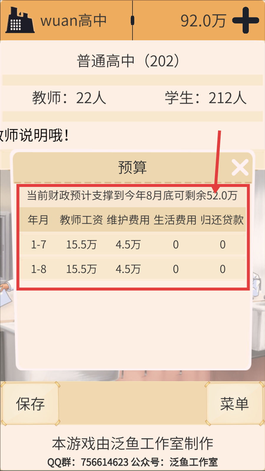 2、在预算界面关注【当前财政预计支撑到今年8月底可剩余52.0万】,分析【教师工资-15.5万】等支出,合理控制成本。