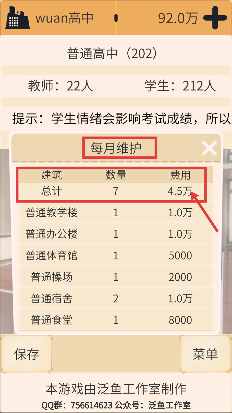 4、关注【每月维护-总计4.5万】,了解各建筑维护费用,合理分配资金,避免因维护费超支影响学校发展。