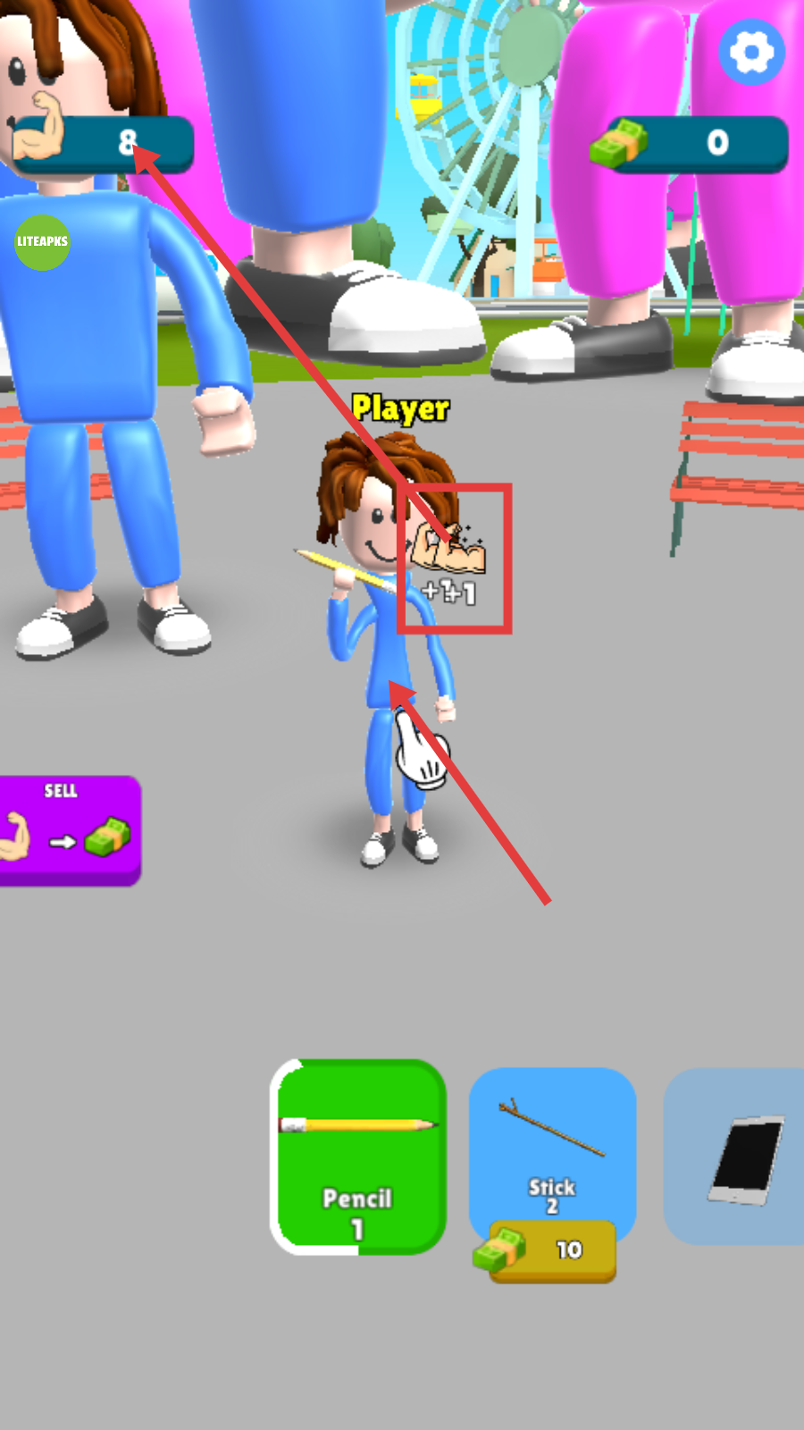 2、游戏中点击角色提升肌肉,关注左上角【+1+1】反馈,持续操作积累肌肉数值,为后续发展奠基。