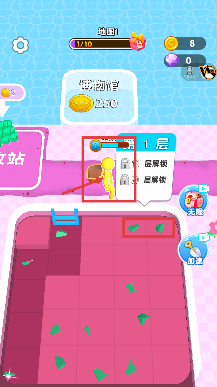 1、在【地图1-第1层】,操控黄色小人拿工具挖掘绿色矿石,积累资源,可查看【博物馆-250】金币目标,熟悉挖矿操作。