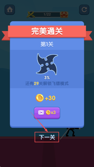 3、进入下一关:在完美通关界面,点击“下一关”按钮,继续游戏。