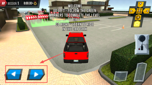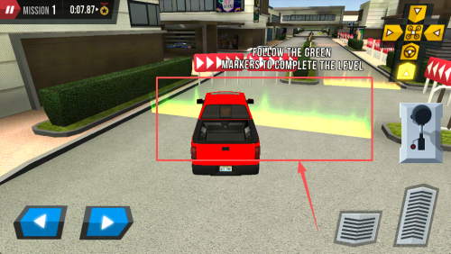 3、然后,按屏幕底部左右方向键,左侧绿箭头提示,右侧箭头提示,在停车场内沿绿色标记行驶并收集金币。