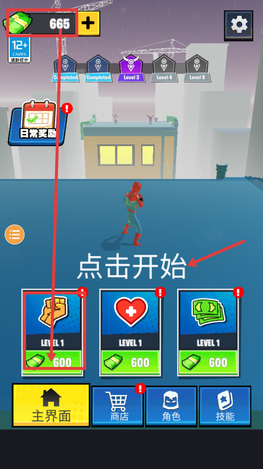 1、注意12+-CADPA适龄提示,拥有665钞票时点击【点击开始】,可消耗600钞票升级【拳头-LEVEL1】提升战力。