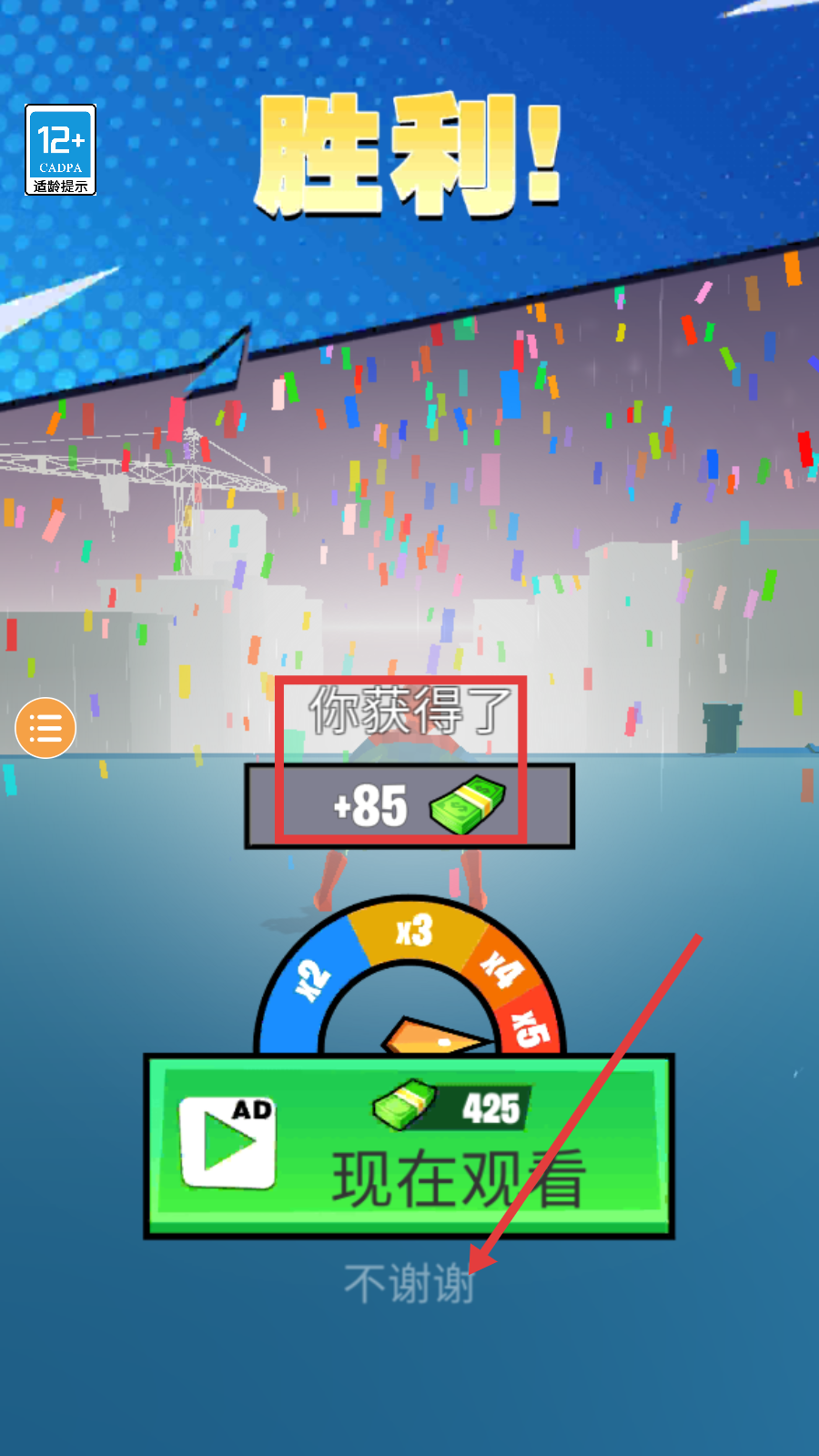 4、通关后获得+85钞票,若不想观看广告点击【不谢谢】,继续积累资源挑战下一关。