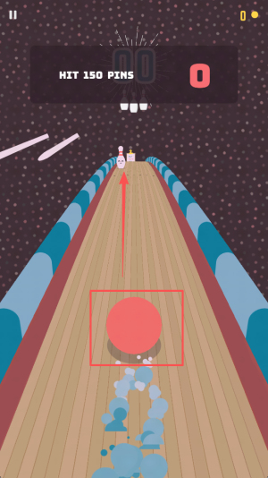 3、然后,看到“HIT 150 PINS”目标提示,滑动屏幕投球,争取一次击倒150瓶以上。