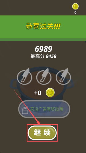 4、最后,看到“恭喜过关!!”与最高分8458后,点击“继续”即可进入下一关。