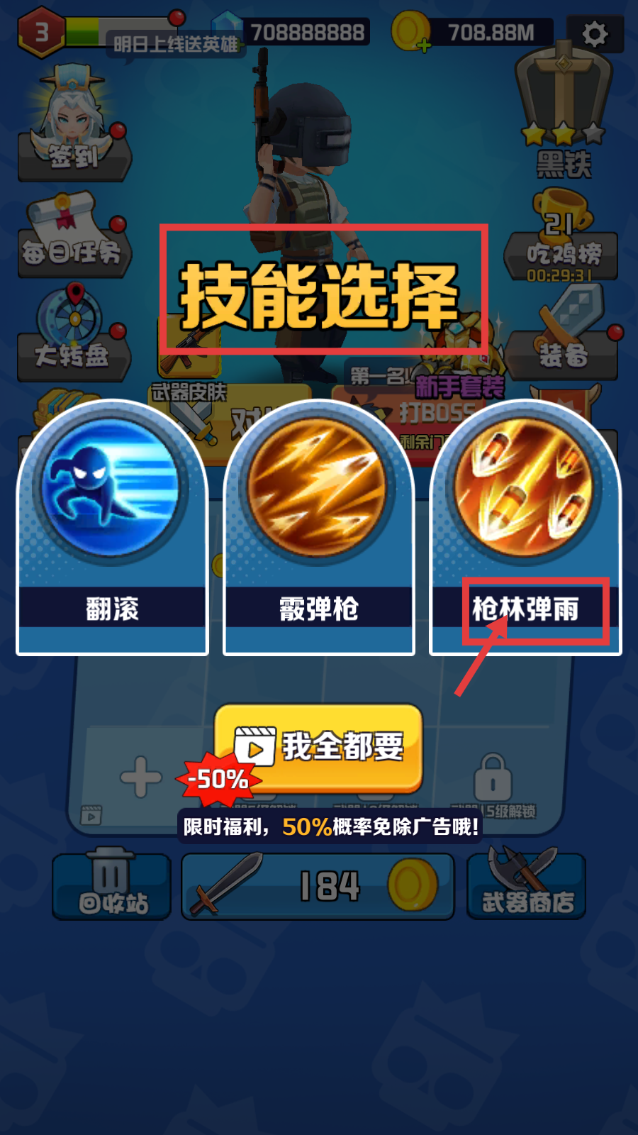 1、技能选择时可优先选【枪林弹雨】,也可利用限时福利【我全都要】,50%概率免广告获取全部技能。