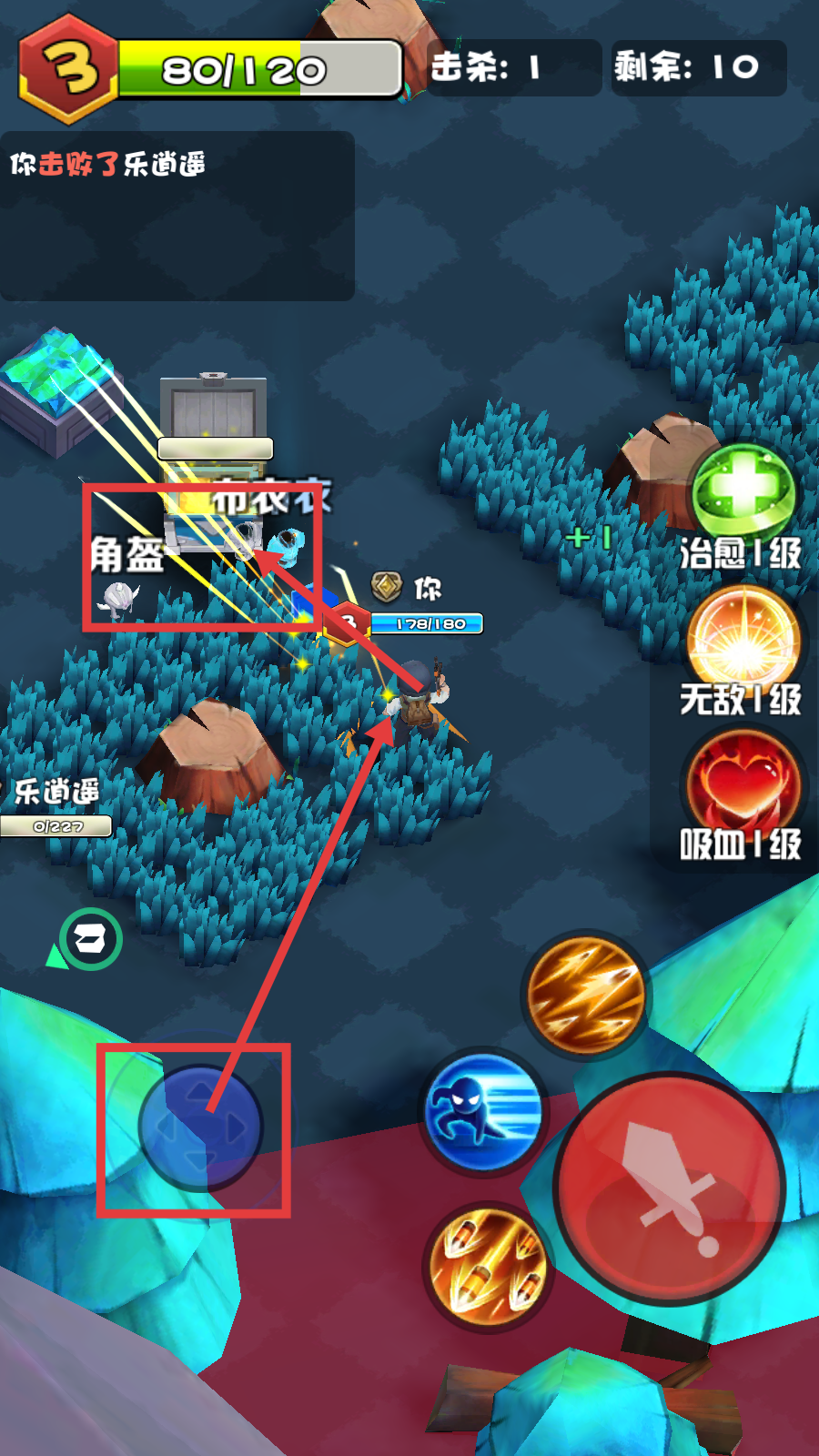 2、战斗中用蓝色方向键移动,优先拾取【角盔】提升装备,搭配【治愈1级-无敌1级-吸血1级】技能增强生存与输出。