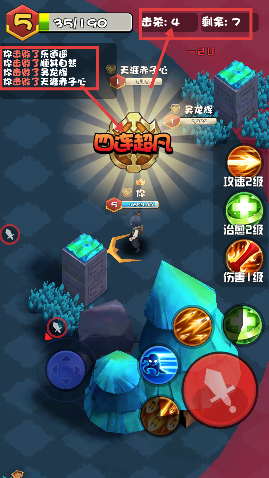3、持续战斗达成【四连超凡】,关注【击杀:4-剩余:7】信息,搭配【攻速2级-治愈2级-伤害1级】技能提升连杀效率。