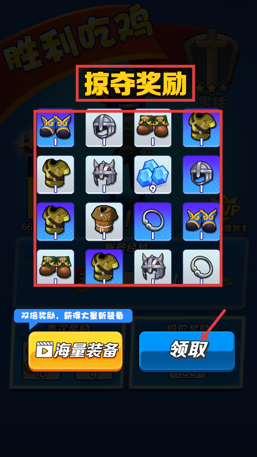 4、胜利吃鸡后领取【掠夺奖励】,获取大量装备资源,可选择观看广告获取双倍奖励或直接点击【领取】。