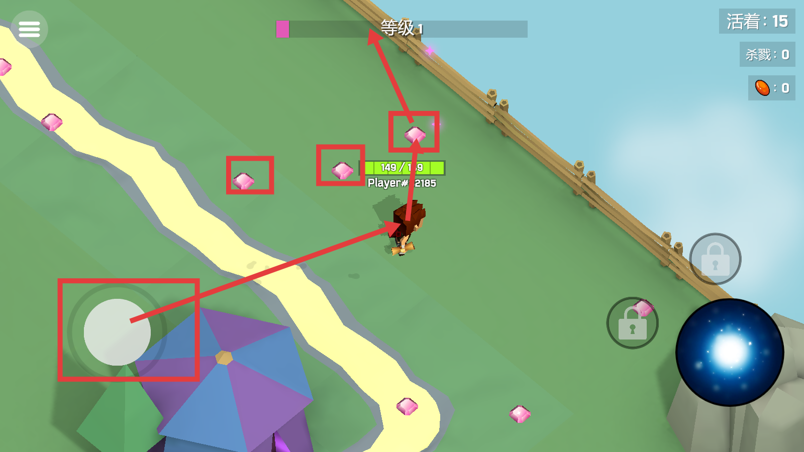2、等级1地图中,用左侧摇杆移动角色,优先收集粉色宝石,关注“活着”“杀戮”计数,熟悉地图环境与操作机制。