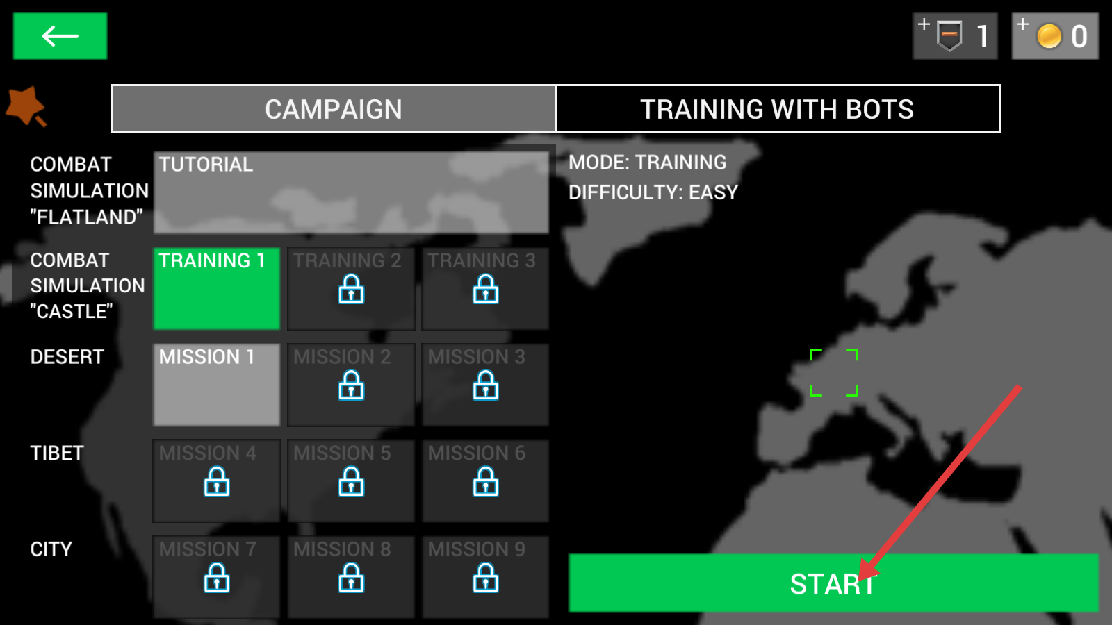 1、在训练模式界面选择【TRAINING1】,点击【START】,开启城堡场景的战斗训练,熟悉游戏机制。