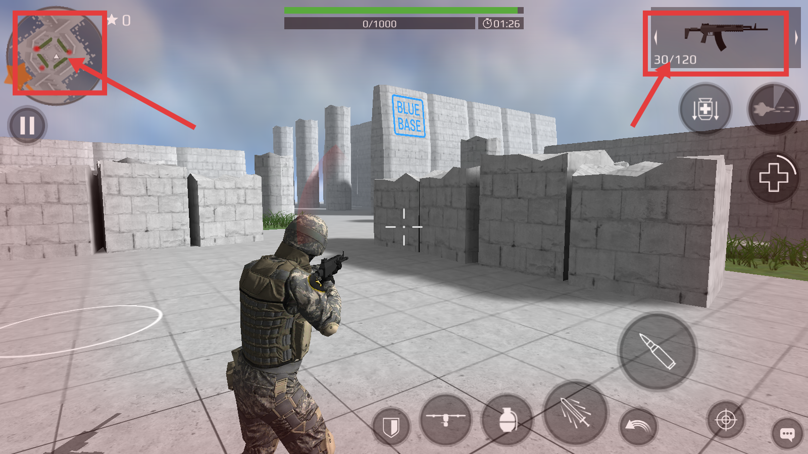 2、进入城堡战斗场景后,利用左上角小地图观察战场布局,留意武器弹药状态(如30/120),规划移动与攻击路线。