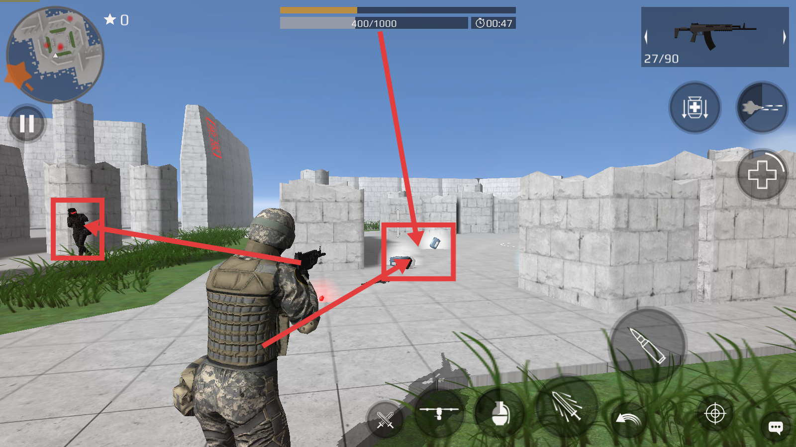 3、战斗中打击敌方士兵,收集战场道具,积累分数(如400/1000),提升战斗效率。