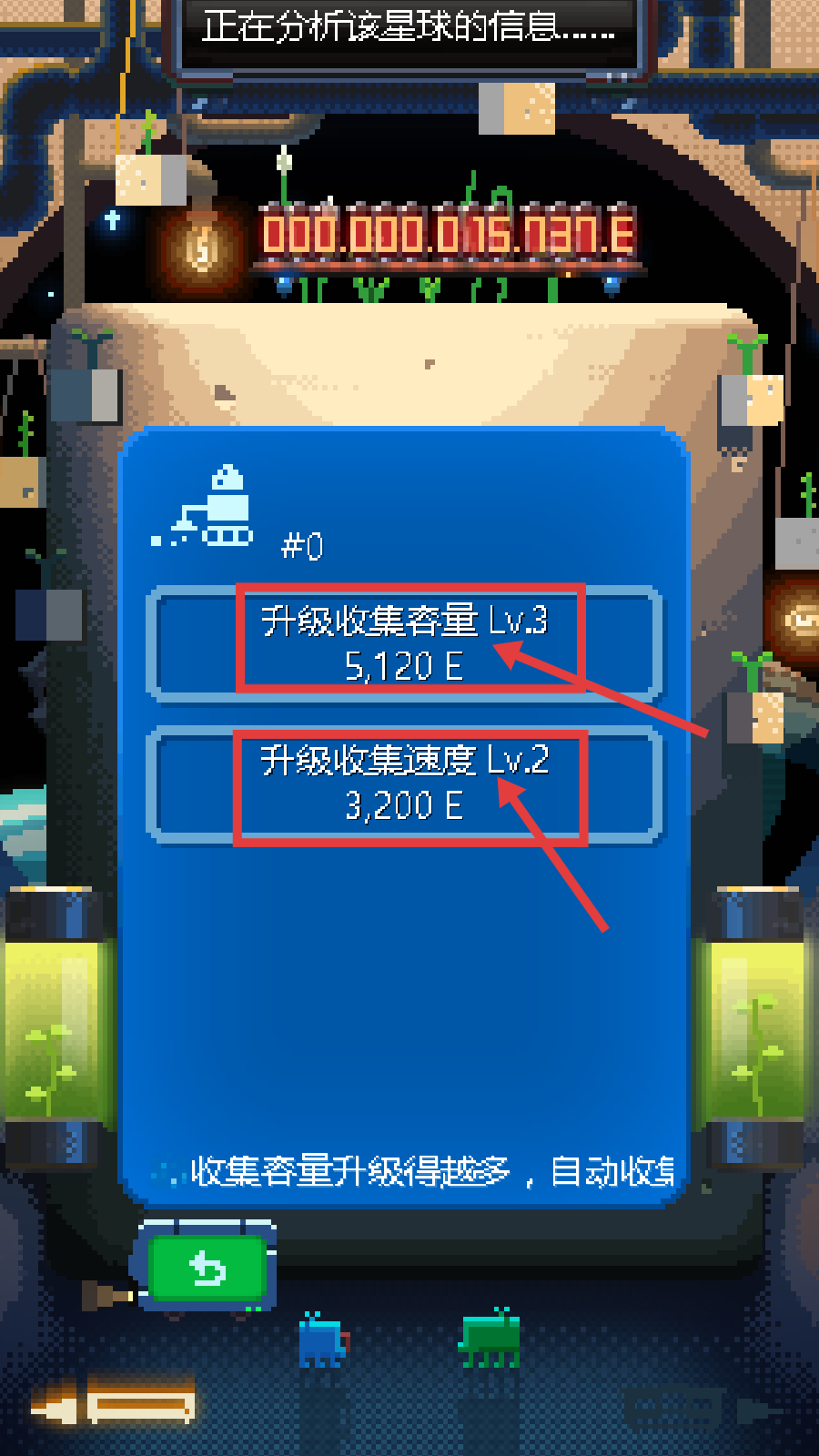 3、在升级界面,优先升级收集容量(如Lv.3,消耗5,120E)和收集速度(如Lv.2,消耗3,200E),提升资源获取效率,为后续探索提供保障。