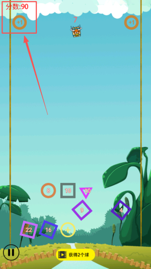 3、触发反弹消除:发射弹球后,借助场景边界或方块反弹,让弹球多次跳动,击中数字方块使其减少或消失,积累分数。