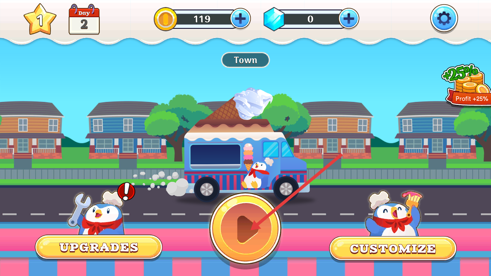 1、进入游戏后,可先了解【UPGRADES】和【CUSTOMIZE】功能,点击中间播放按钮开始在【Town】经营冰淇淋车,开启赚钱之旅。