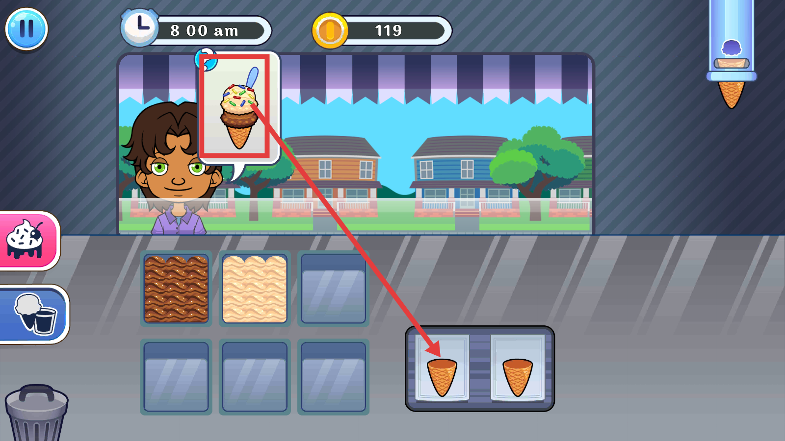 3、面对多位顾客的不同冰淇淋需求,除了基础蛋筒,还要添加对应的配料,如彩色糖屑等,精准满足需求以提升收益。