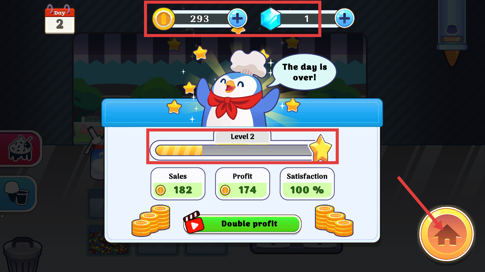 4、一天经营结束后,可获得【金币】【钻石】和等级提升,查看【Sales】【Profit】等数据后,可利用双倍收益功能或点击按钮返回主界面。