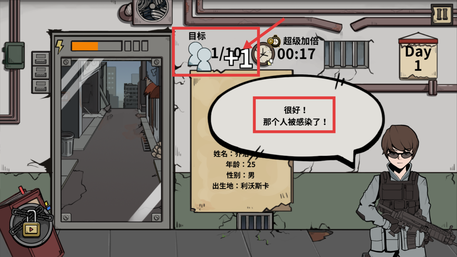4、成功驱逐符合条件的人物后,会达成【目标+1】,同时注意判断是否为【被感染】人员以准确完成任务。