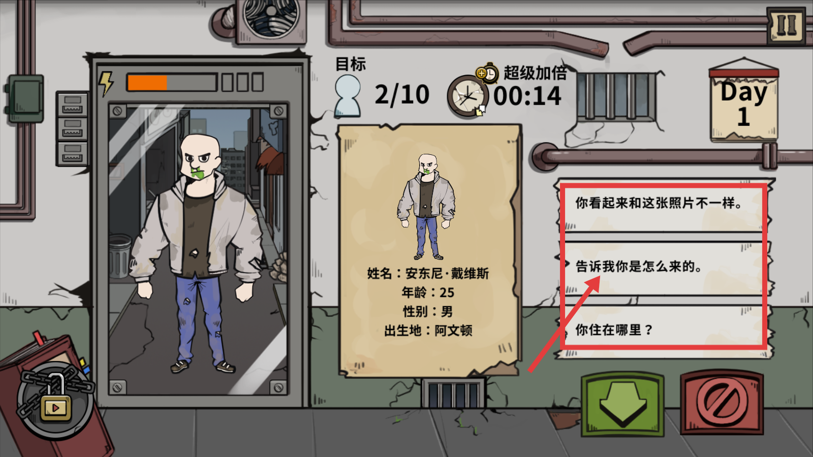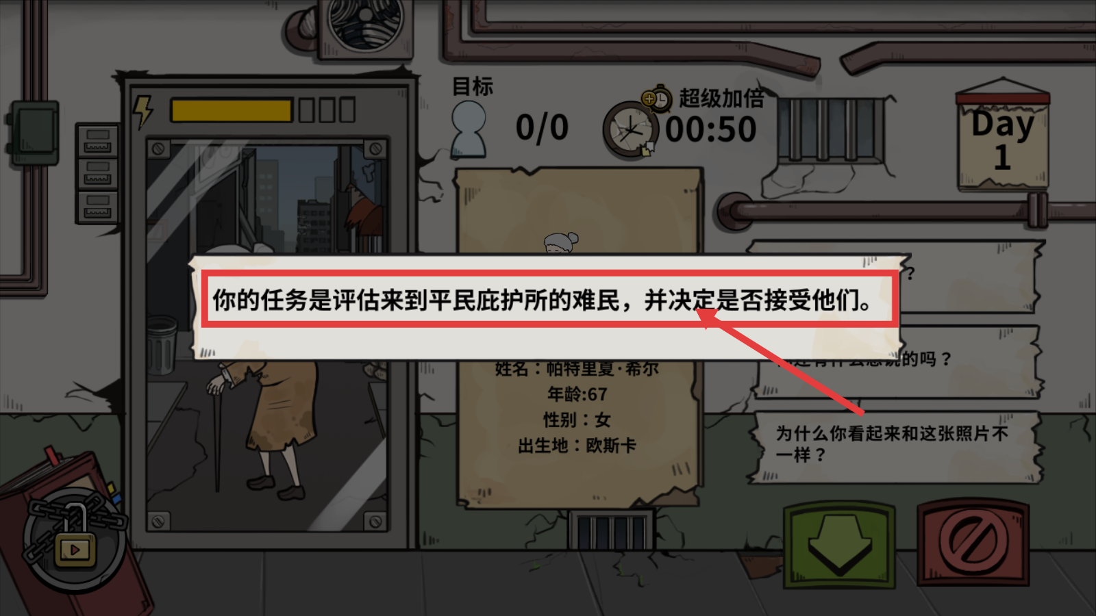 2、对比人物与资料,留意【你看起来和这张照片不一样】【告诉我你是怎么来的】等判断选项,精准识别不符合条件的难民。