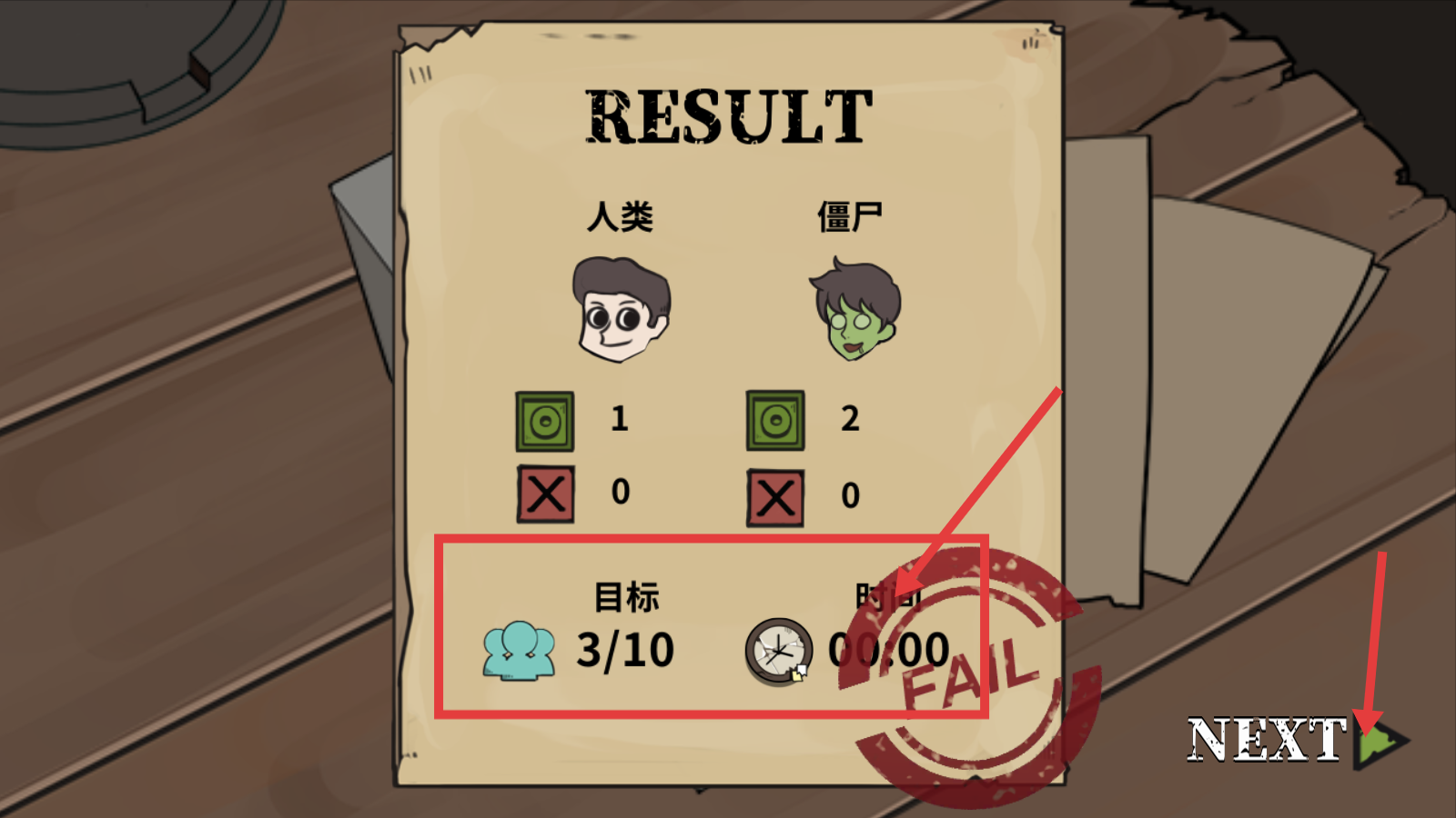4、关注【RESULT】界面的目标完成度和时间,若未达成目标且时间耗尽则任务失败,点击【NEXT】继续游戏。