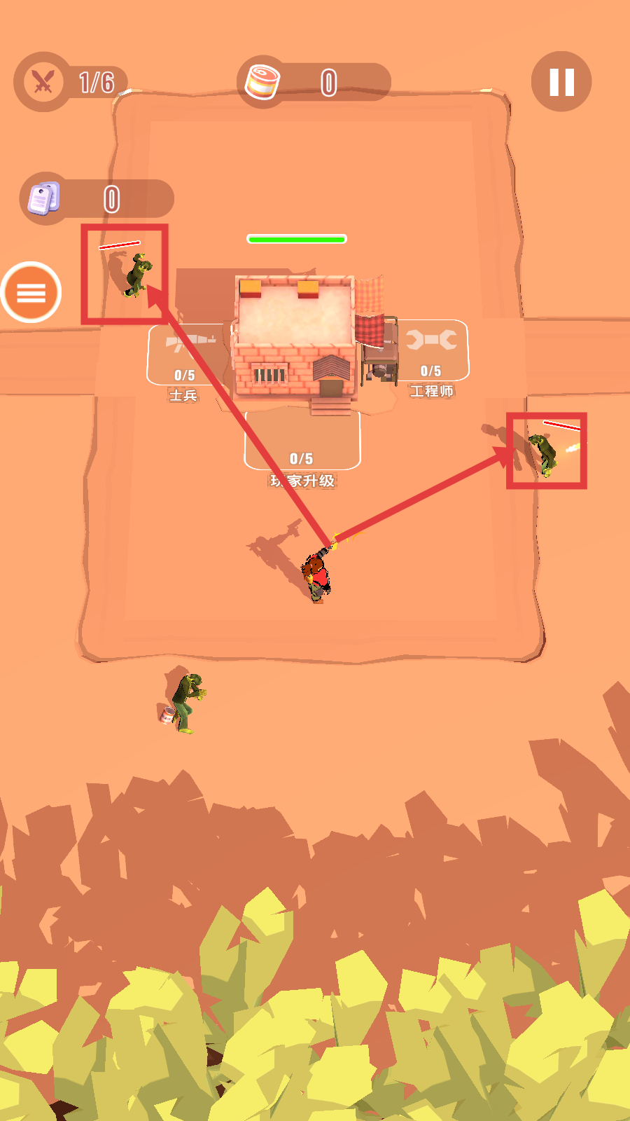 2、战斗时瞄准红色框选的敌人进行攻击,清除来犯的绿色敌人,保护己方建筑。