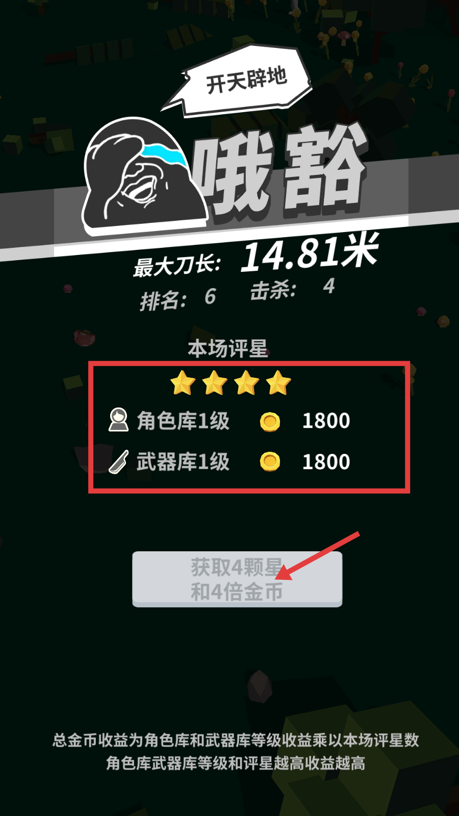4、战斗结算时可获得【角色库1级-1800】【武器库1级-1800】金币,提升库等级以增加收益。