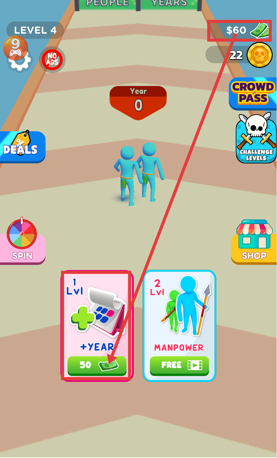 1、在LEVEL-4中,利用【$60】资源升级【+YEAR】,提升文明年份,同时可借助功能增强人力,开启发展进程。