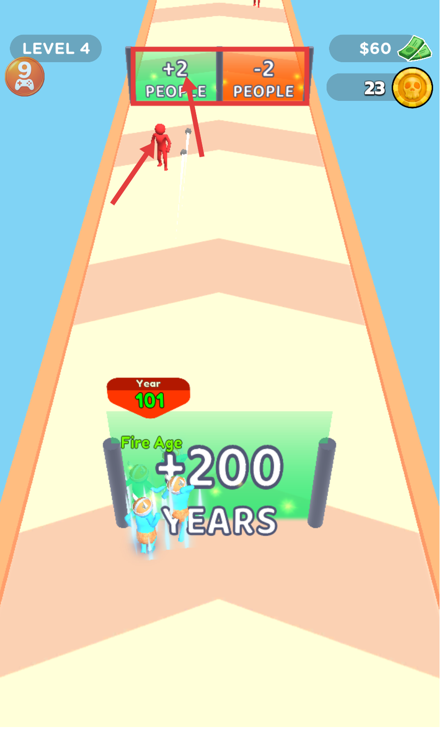 2、奔跑时优先选择【+2-PEOPLE】和【+200-YEARS】的增益区域,快速积累人口与年份,推动文明发展。