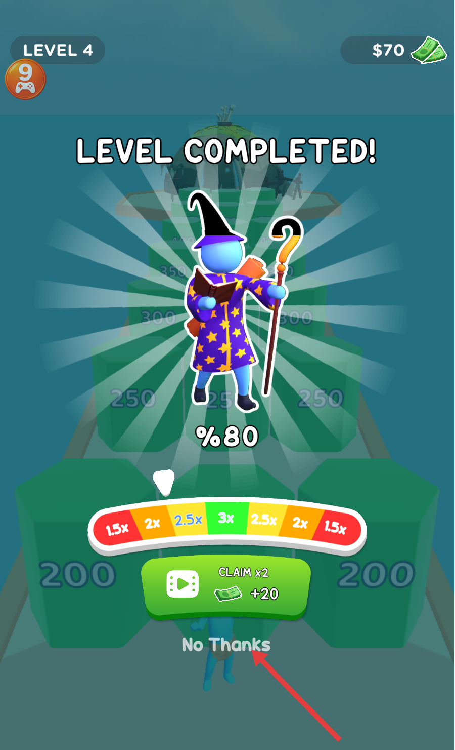 4、完成LEVEL-4后,可选择【NoThanks】跳过奖励,或观看视频获取双倍金币,继续下一关挑战。