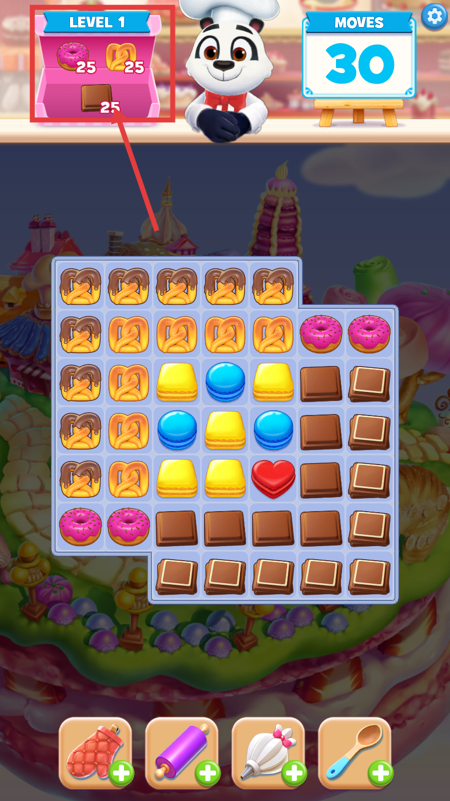 1、在LEVEL-1中,明确需收集【甜甜圈-25】【椒盐卷饼-25】【巧克力-25】,利用30次移动机会,开始布局消除。
