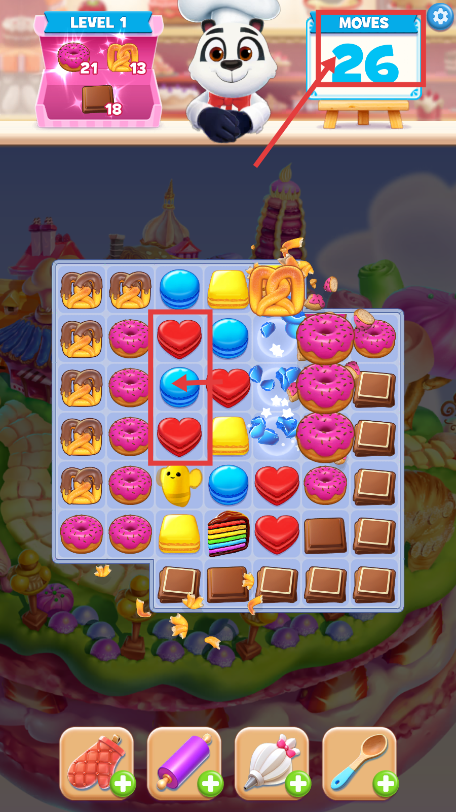 2、关注【MOVES-26】剩余次数,通过组合消除如心形、马卡龙等元素,快速减少目标物品数量,推进关卡进度。