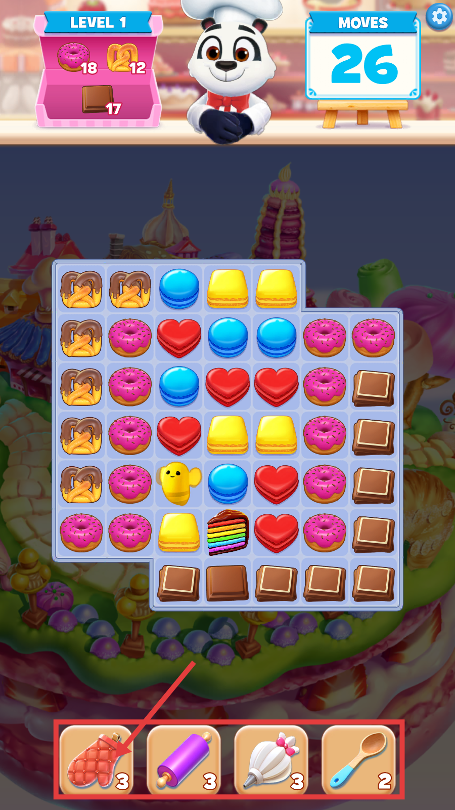 3、善用底部【烤手套-3】【擀面杖-3】等道具,借助其消除能力,高效收集目标物品,提升通关效率。