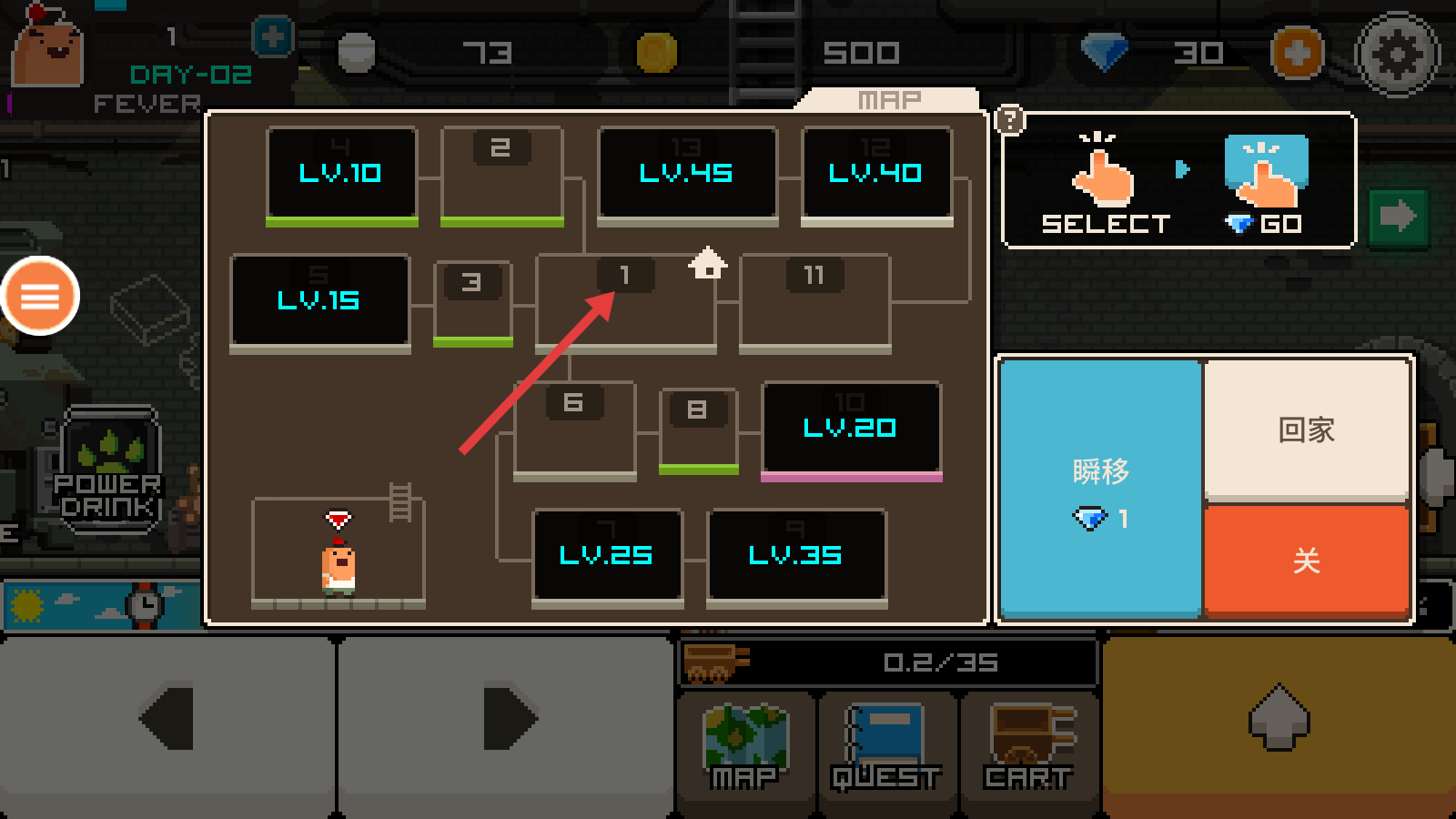 1、在地图界面选择关卡(如LV.1),推进任务进程,开启新的资源收集区域。
