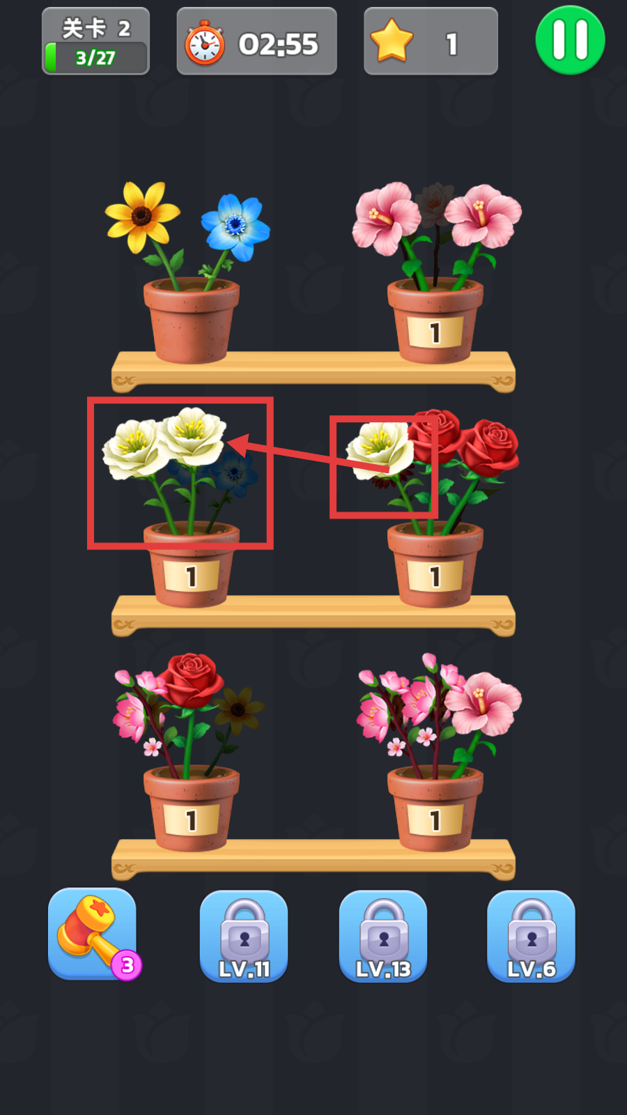 1、在关卡中寻找相同种类的花朵进行组合,如白色花朵的组合,完成后可推进关卡进度(如从3/27提升至6/27)。
