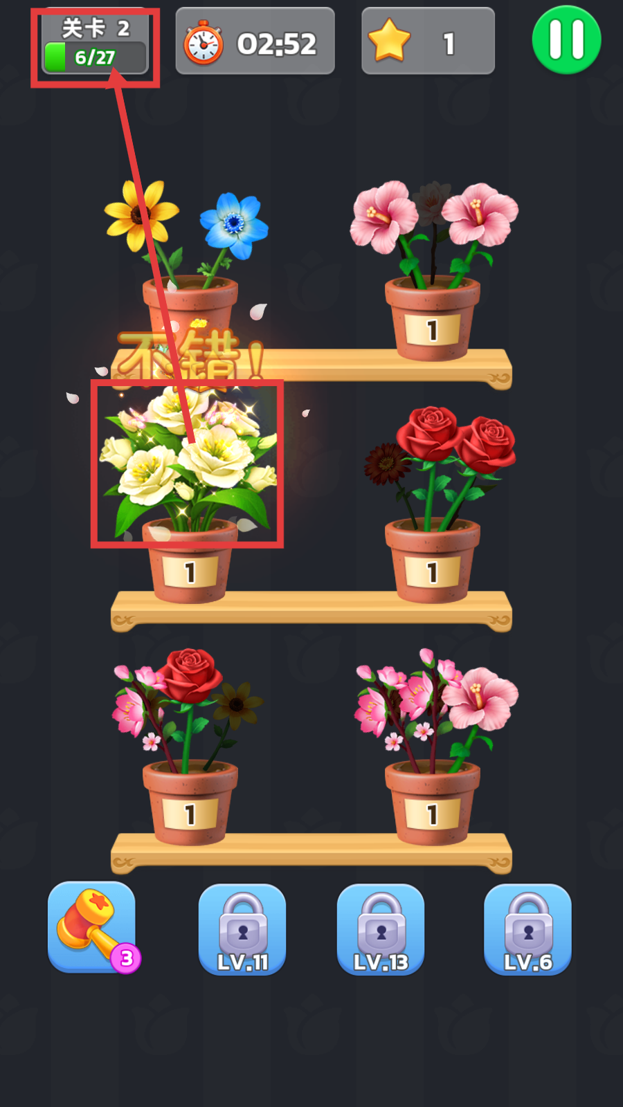 2、完成花朵组合后会出现“不错”的视觉反馈,同时关卡进度条会更新,提示操作有效。