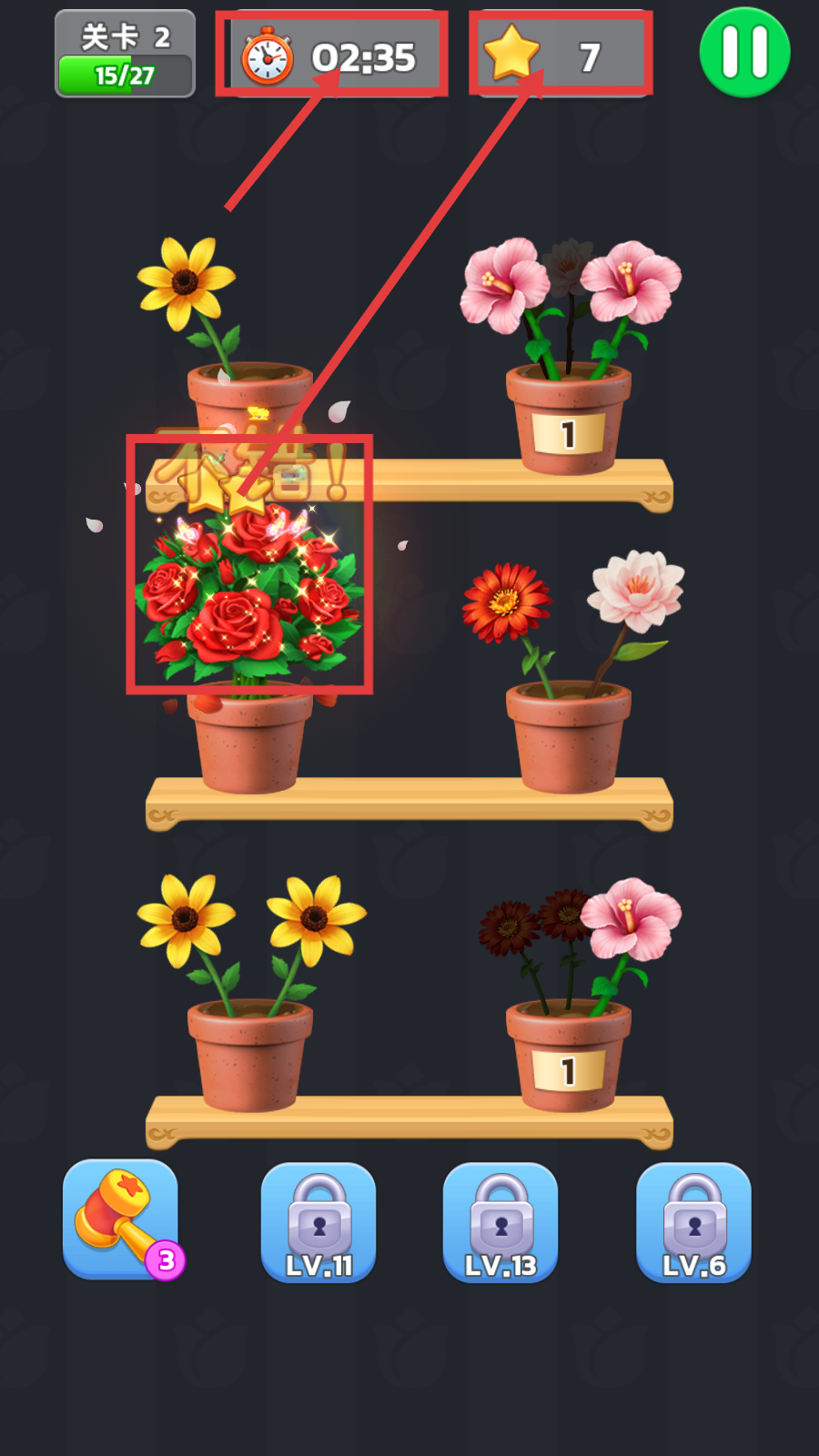 2、关卡目标差异化明显,涵盖限时分数挑战、特定花束收集、障碍清除等类型,后期关卡融入隐藏花朵机制,提升解谜深度。