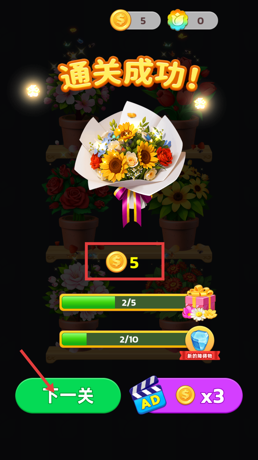 4、通关后可获得金币(如5枚),点击“下一关”继续挑战新关卡,积累资源解锁更多内容。