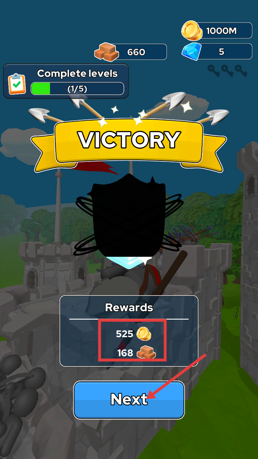 4、战斗胜利后,领取【Rewards-525金币-168砖块】,点击【Next】进入下一关,积累资源用于升级强化。