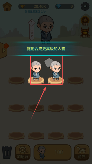 2、利用加速器提升合成效率,拖放相同人物进行合并,获得更高级角色。