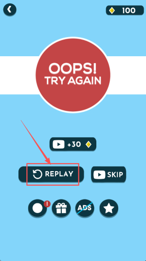4、若出现「OOPS! TRY AGAIN」,点击「1+30」复活或选择「SKIP」跳过本关。