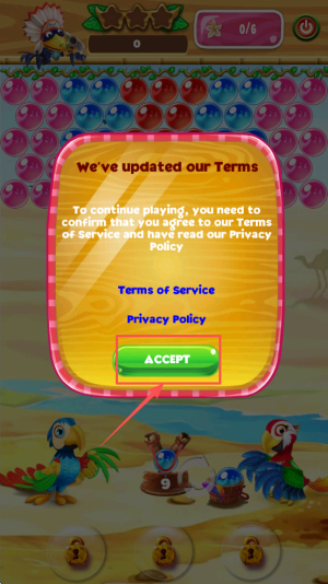 2、在条款更新页阅读说明,点「ACCEPT」确认同意服务与隐私政策,继续游戏。