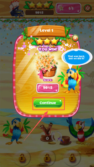 4、当进度显示「6/6」且出现「YOU WIN!」,点「Continue」收下9815分并进入下一关。