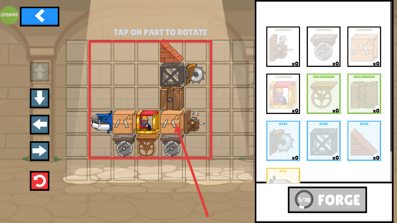 1、在战车编辑界面,将右侧【COMMON】【UNCOMMON】【RARE】【EPIC】级新部件拖拽到网格,完成战车装备升级,强化战力。