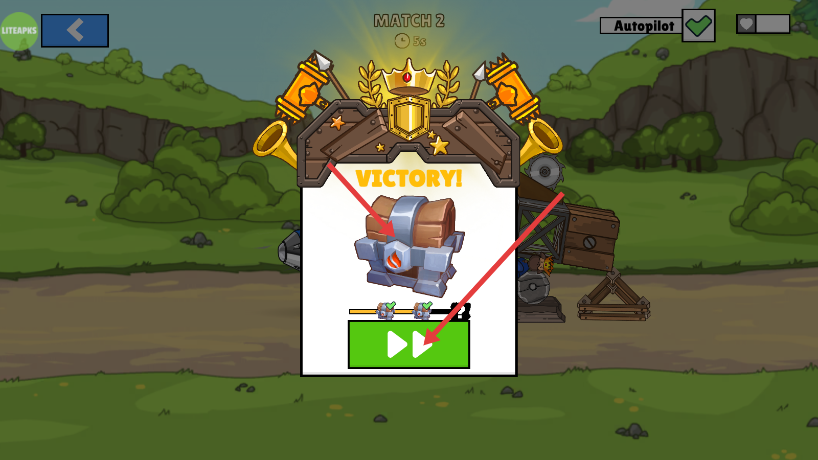 4、对战胜利后出现【VICTORY!】提示,点击绿色按钮继续,可获取宝箱奖励,积累资源用于后续战车升级。