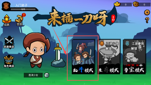 3、在“入门弟子”界面选“生存模式”,先解锁“百炼宝刀”提升伤害,再进关卡。