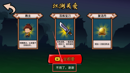 4、若战败弹出“江湖关爱”,点“百炼宝刀+复活丹”组合续命;若想省金币,按“不用了,谢谢”直接重开。